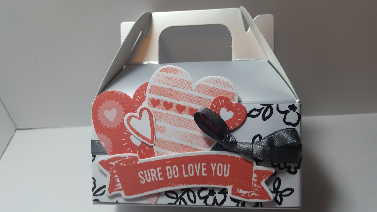 We decorated a Silver Mini Gable Boxes with the Petal Passion Designer Series Paper, the Sure Do Love You stamp set, the Lots of Love Box Framelits Dies, and Basic Gray 3/8" Stitched Satin Ribbon.